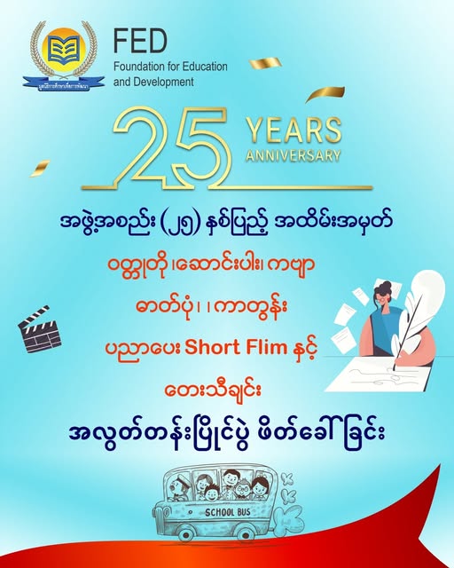 ထိုင်းနိုင်ငံတောင်ပိုင်းတွင် အခြေစိုက်သည့် ပညာရေးနှင့် ဖွံ့ဖြိုးတိုးတက်ရေးဖောင်းဒေးရှင်း (FED)၏၂၅ နှစ်ပြည့် ငွေရတု အထိမ်းအမှတ်ပွဲကို လာမည့် ဒီဇင်ဘာလ ၆ ရက်နေ့တွင် ကျင်းပမည်ဖြစ်ကြောင်း FED အမှုဆောင် ဒါရိုက်တာ ဦးထူးချစ်က Migrant Times ကိုပြောကြားသည်။