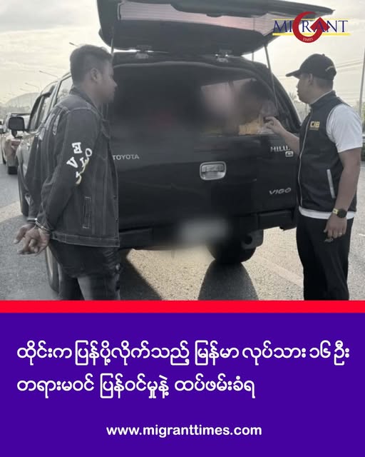 ထိုင်းနိုင်ငံ ၊ ချွန်ဖွန်ခရိုင်၊ မူးအန်မြို့နယ်၊ အာရှလမ်းပေါ်တွင် ကားတစီးအတွင်းမှ မြန်မာ ရွှေ့ပြောင်းလုပ်သား ၁၆ ဦးအား ရဲတပ်ဖွဲ့ကဖမ်းဆီးခဲ့ကြောင်း ထိုင်းသတင်းက ယနေ့ဖော်ပြသည်။